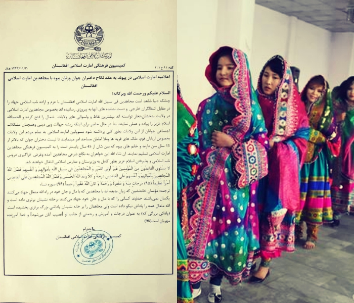 «محبت نیوز»- در دستورالعملی که به امضای کمیسیون فرهنگی امارات اسلامی افغانستان (طالبان) رسیده است، از بزرگان طوایف، اقوام و ائمه جماعت مساجد تحت تصرف خود خواسته‌ است تا هر چه سریع‌تر اسامی و مشخصات دختران بالای ۱۵ سال و زنان بیوه زیر ۴۵ سال را برای عقد اجباری با سربازان طالبان اعلام کنند.