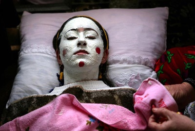 بر اساس این رسم صورت عروس در حضور اقوام و خویشان به رنگ سفید در میآید و به شکلی گویا ترسناک آرایش میشود. عروسهای این روستا با همین ظاهر سر سفره عقد مینشینند و پس از جاری شدن عقد است که صورت عروس را پاک کرده و داماد چهره واقعی همسر آینده خود را میبیند.