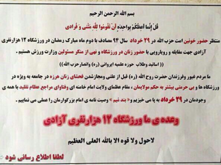 در اين فراخوان آمده «ما فرزندان روح الله قبل از علنی و مجاز شدن فحشای زنان هرزه در جامعه به ويژه در ورزشگاه ها به پا خواهيم خواست.»