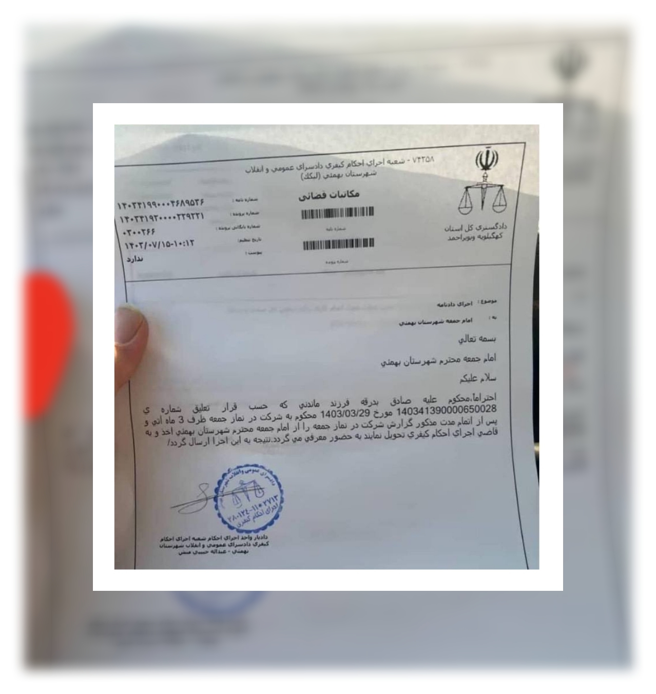 معرفی یک محکوم به شرکت در نماز جمعه ظرف سه ماه، به امام جمعه شهرستان بهمئی توسط قاضی اجرای احکام کیفری دادسرای این شهرستان!...
